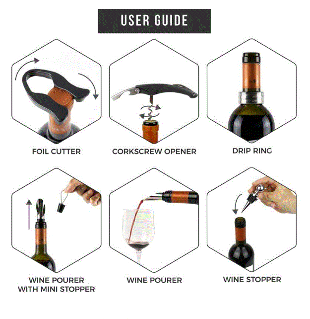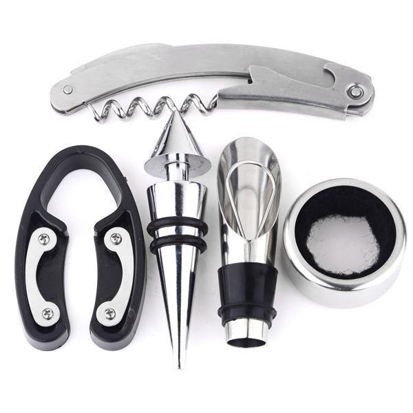 This 5-piece set comes with a bottle opener, aluminum foil cutter, wine stopper, drip ring, and wine pourer - everything you need to fully enjoy your wine.